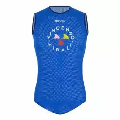 Maillot de corps de la collection Vincenzo Nibali de Santini, inspiré du design italien des années 60, avec des couleurs unies, des motifs abstraits et une typographie qui fait référence à la fois à sa Sicile natale, à son surnom ‘Lo Squalo dello Stretto’ et à ses victoires sur les trois Grands Tours.